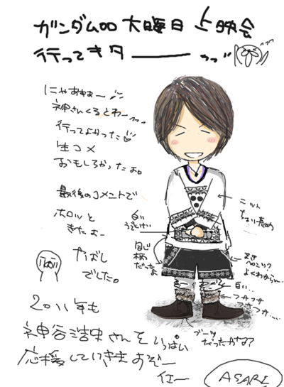 は い!00上映会行ってきました。まさか神谷さんくるとは予想はしてなかったので、会場で名前が発表されたときは、うれしかったです。それと情報ありがとう ございました。